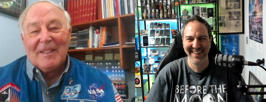 Before we wrapped the interview, Jerry Ross was joined by a young visitor named Brandon Surnitsky, a twelve year old student serving as a production and archival assistant on Before The Moon. Brandon is completing this work as a Chesed volunteer project for his Bar Mitzvah training at his synagogue. His father, Craig, who serves as President of the congregation, reflected on the moment and said, “I’ve watched many students choose service projects, but Brandon’s stood out. He has been passionate about space for half his life, and speaking with a seven time astronaut was, in his words, a once in a lifetime dream.”