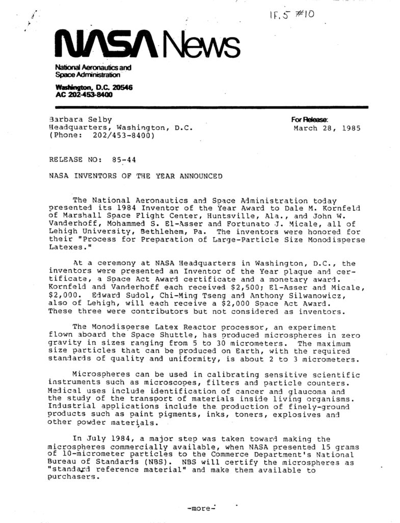 El-Aasser and his collaborators proposed an experiment to study polymerization in space, focusing on the creation of monodisperse latex particles, particles that are nearly identical in size and shape. On Earth, gravity interferes with this process. In orbit, those constraints disappear.